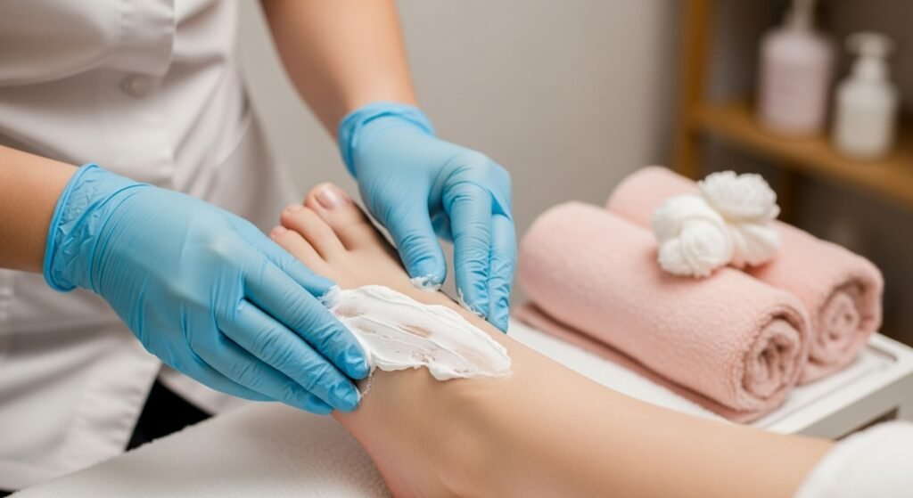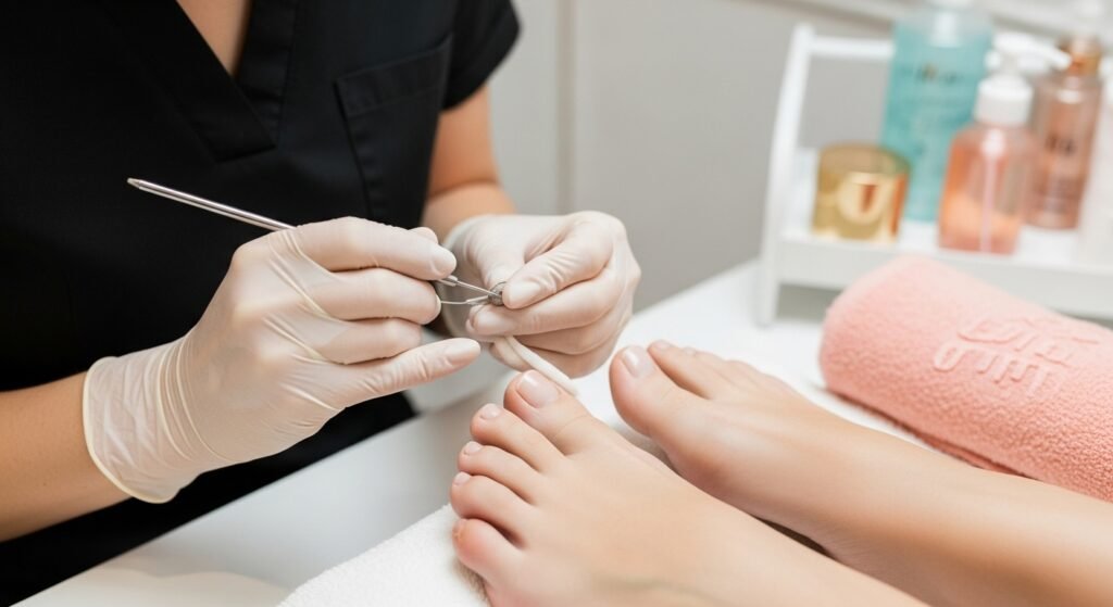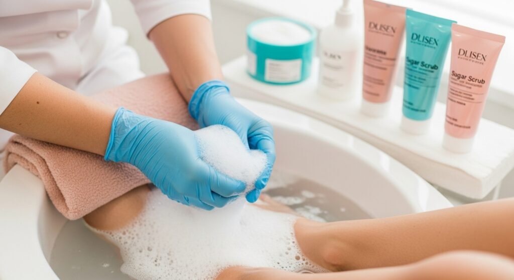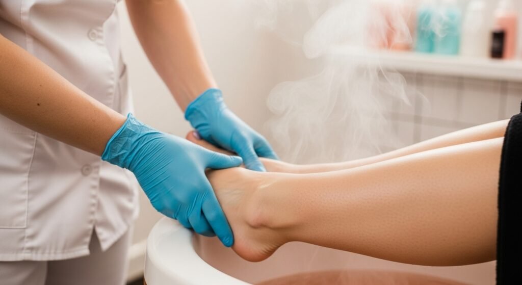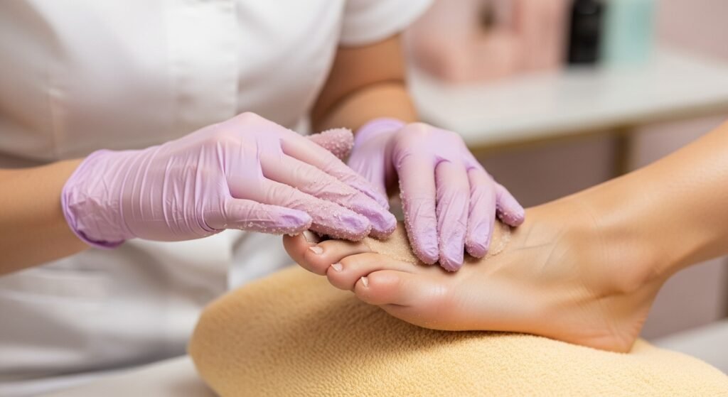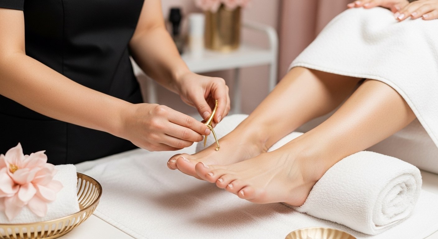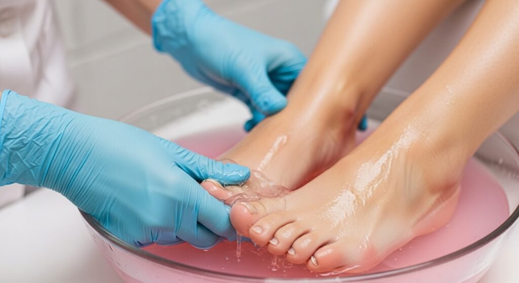 Relaxing soak in Muscle Relief Himalayan salt to ease aches. Organic sugar scrub, callus removal, toenail & cuticle care, 10‑minute leg & foot massage, hydrating mask & hot towel.