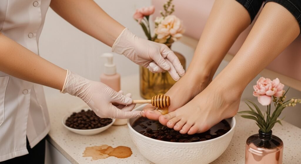 Soak in coffee‑honey mineral salt, callus treatment, coffee‑honey sugar scrub, 10‑minute foot & leg massage, hydrating honey masque and hot towels.